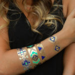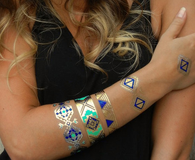 ゴールドやシルバー箔とカラーを合わせて金や銀にきらめくタトゥーが、日差しに映える新感覚ジュエリーで、腕、足首、背中や指などに貼るのがお洒落で、ビーチやパーティ、フェスなどに大活躍間違いなしのアイテムです。